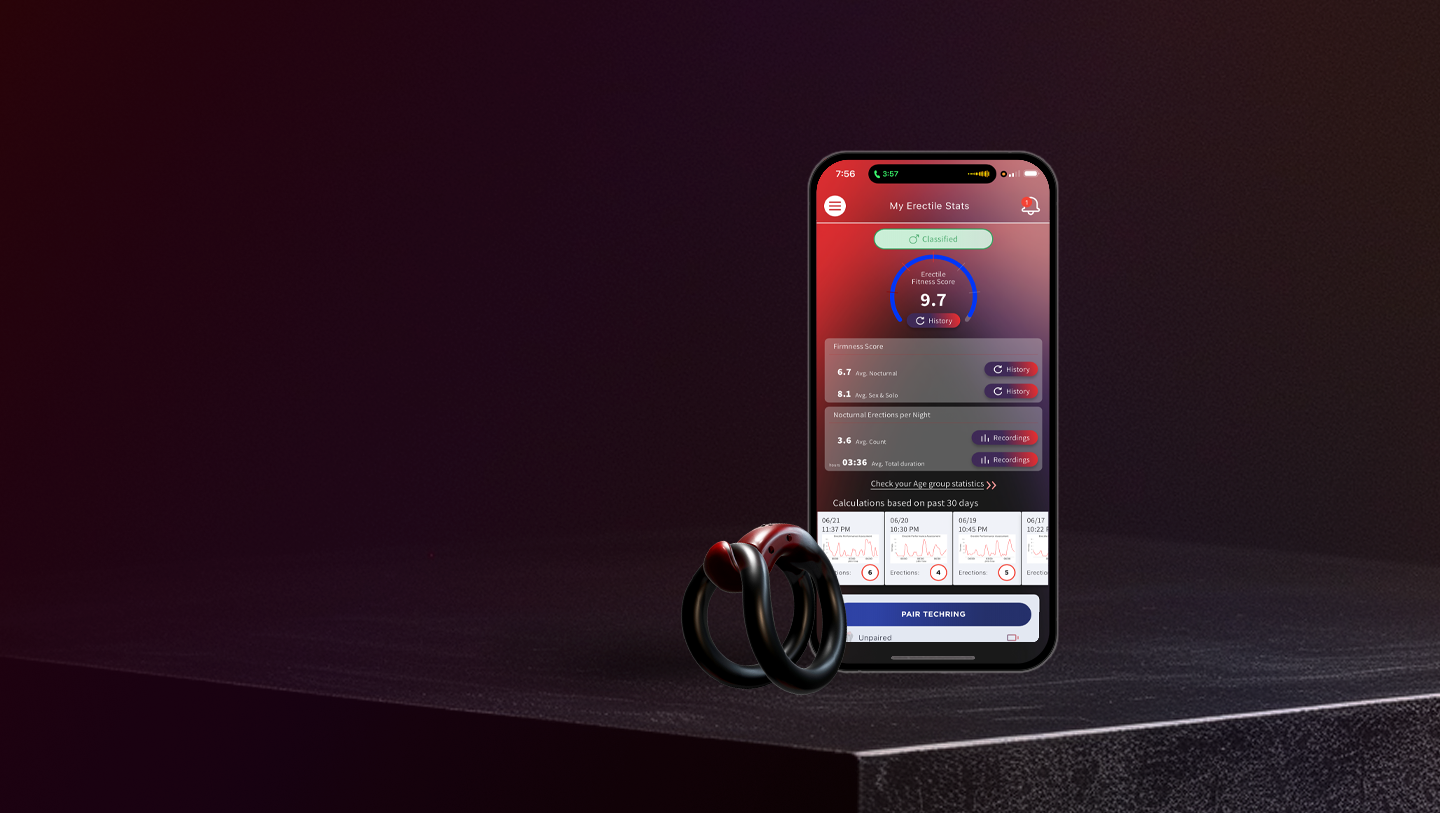 The award-winning TechRing uses sensor technology to comfortably measure your erectile fitness during sex and during sleep.